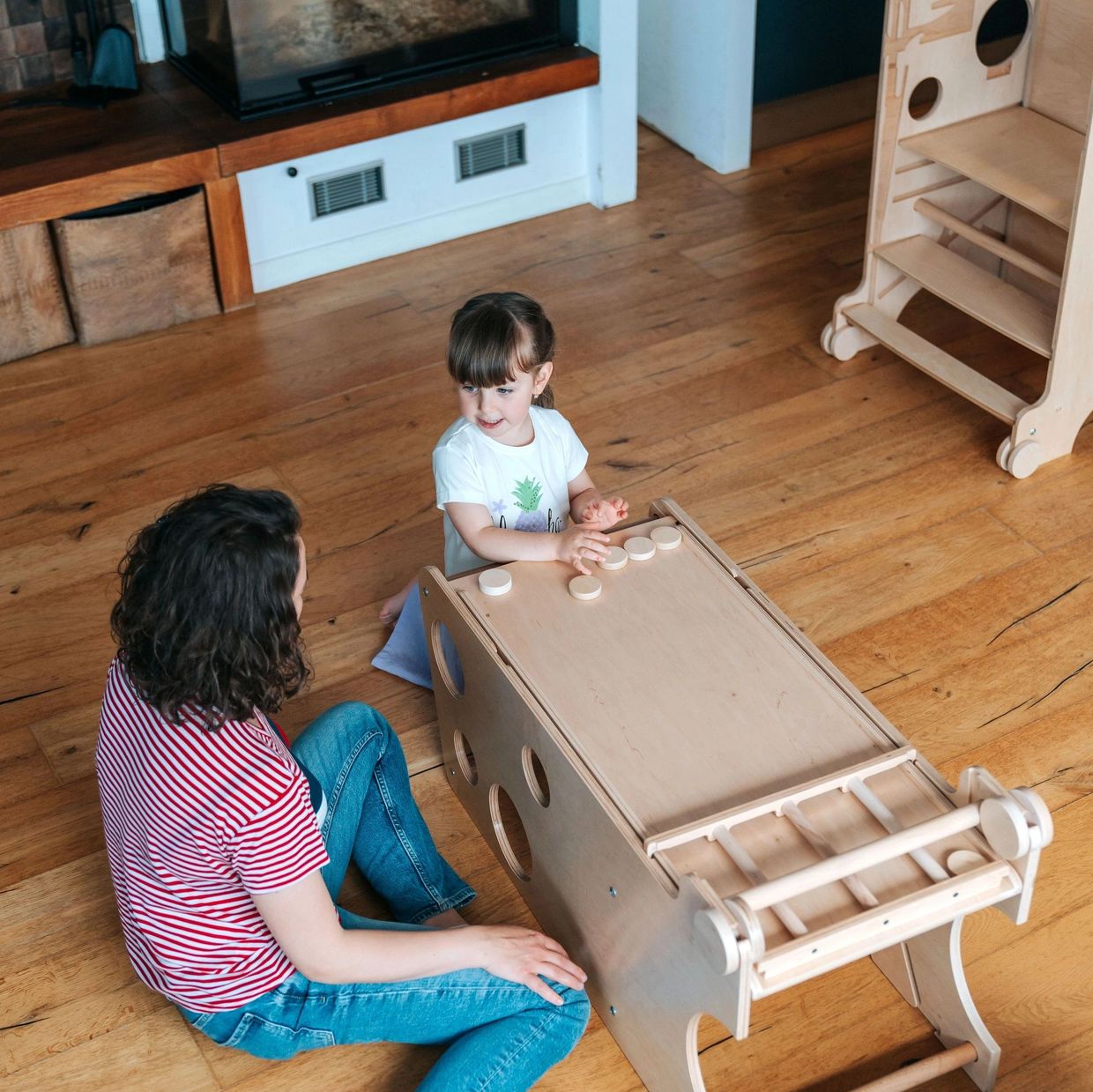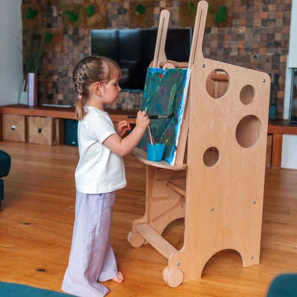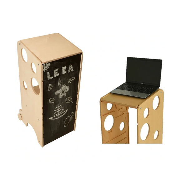 Der Leea Turm hat auch ein Zubehörteil für Erwachsene! Eine besondere Platte wandelt den Turm in ein Stehpult um, an dem du stehend arbeiten kannst.