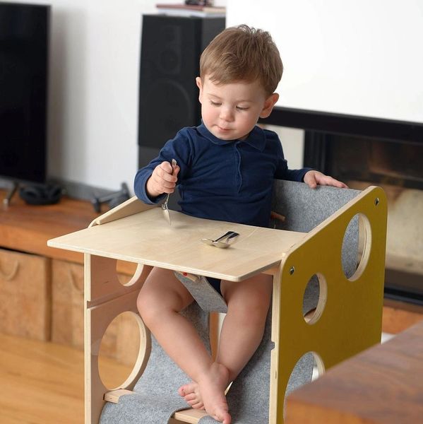 Folge den Anleitungen im Bereich Video, um zu erfahren, wie du den Filzbezug anbringen kannst, um einen Hochstuhl mit Tisch einzurichten.